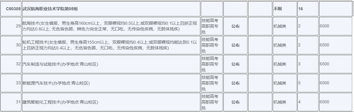 | 43 | 汽车制造与试验技术(办学地点:青山校区) | 技能高考高职高专批 | 公布 | 计算机类 | 2 | 6500 | |