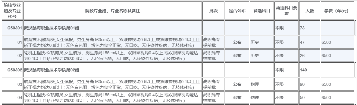 | 40 | 航海技术(女生慎报,男生身高160cm以上,双眼裸视均0.5以上;或双眼裸视均0.1以上且矫正视力均达0.8以上; 无色盲色弱,辨色力完全正常,无口吃,无传染性疾病,无肢体残疾) | 技能高考高职高专批 | 公布 | 计算机类 | 2 | 6500 | |