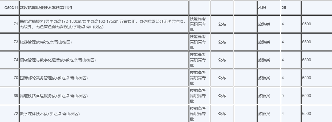 | 51 | 旅游管理(办学地点:青山校区) | 技能高考高职高专批 | 公布 | 计算机类 | 3 | 6500 | |