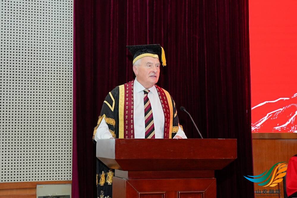 彼得·麦卡弗里代表英国皇家农业大学向毕业生致以诚挚祝愿。他说,毕业是一个值得庆祝的时刻,祝贺同学们获得了满足学位要求的专业知识、广博学识和实践能力,感谢所有勤勉耕耘与热忱奉献的人。山东农业大学与英国皇家农业大学携手二十余载,始终保持着紧密的合作与深厚友谊,双方合作成果斐然,成为中英教育合作的典范,期盼未来能够围绕气候变化、粮食安全、土地可持续利用等,培养更多优秀人才。彼得·麦卡弗里希望同学们以成为英国皇家农业大学的校友而自豪,并勉励同学们全面发挥各种技能和能力,短期内做好迎接平凡工作的准备,但要永远怀揣梦想,做各项事业的先驱者和开拓者,让世界变得更加丰富,更富有希望。