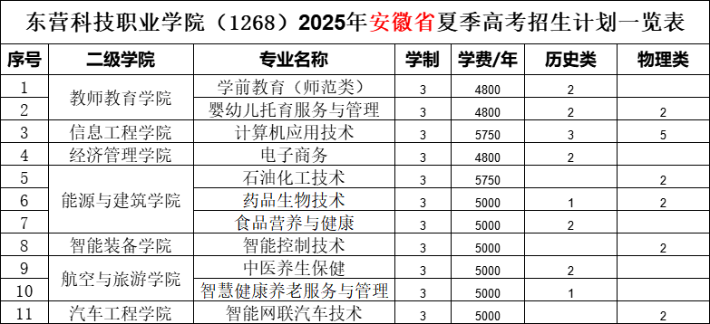 东营科技职业学院2025年安徽省各招生批次及专业计划