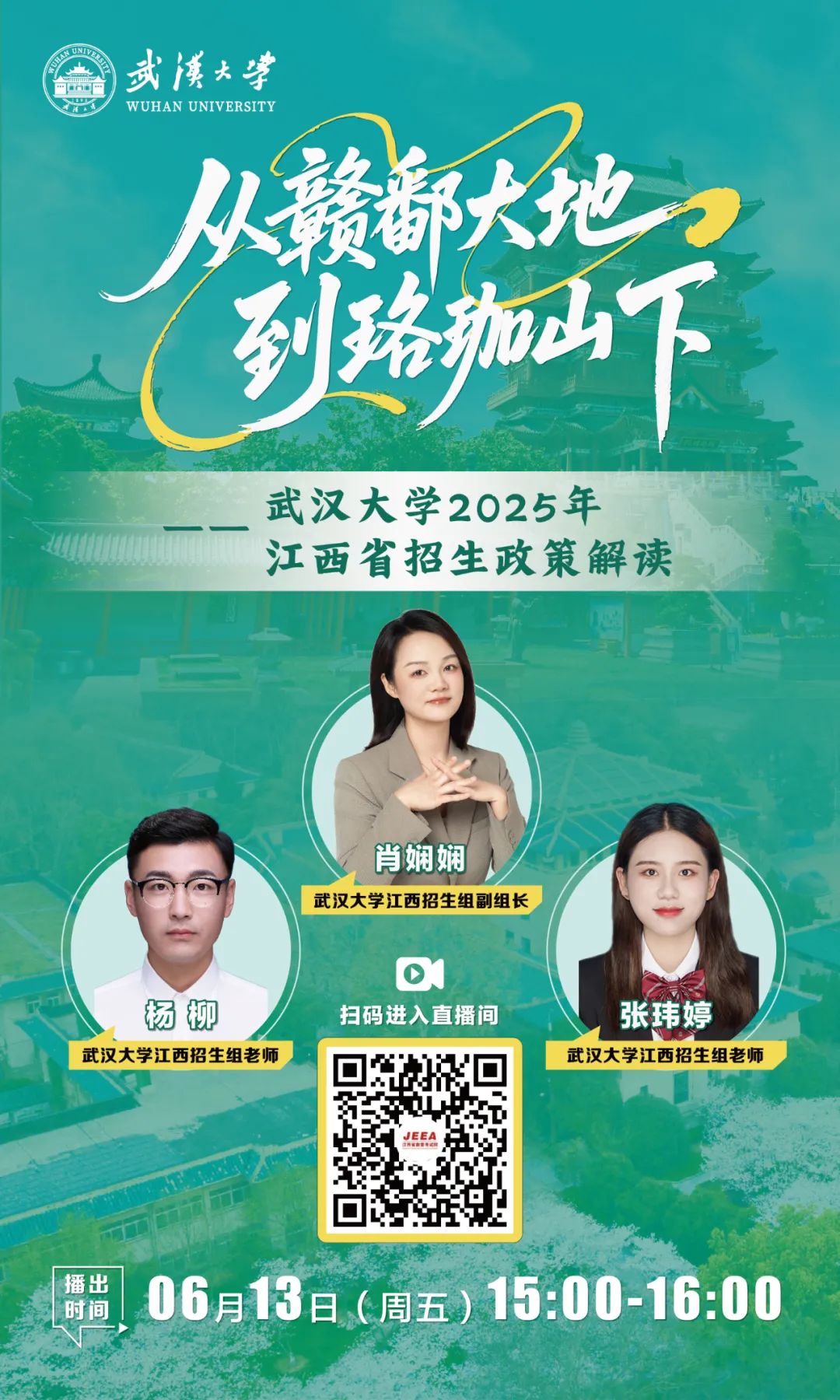 6月13日,江西省教育考试院2025年“高考直通车”线上直播将先后迎来华中科技大学、武汉大学两所高校,招生老师将在直播间为您答疑解惑!