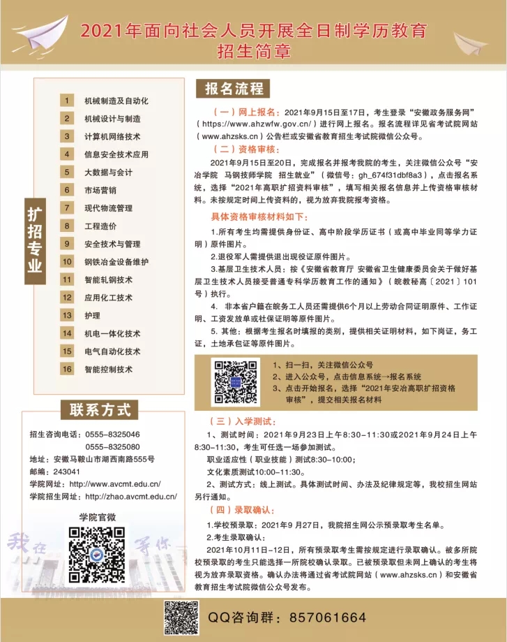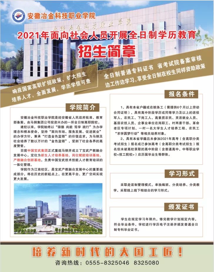 2021年安冶学院面向社会人员开展全日制学历教育招生简章