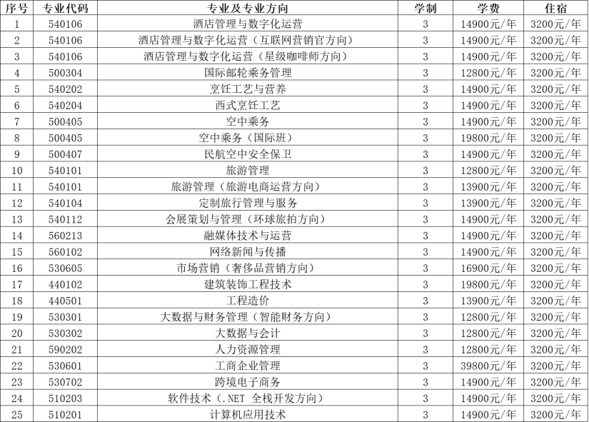 第九条开设专业:酒店管理与数字化运营、酒店管理与数字化运营(互联网营销官方向)、酒店管理与数字化运营(星级咖啡师方向)、国际邮轮乘务管理、烹饪工艺与营养、西式烹饪工艺、空中乘务、空中乘务(国际班)、民航空中安全保卫、旅游管理、旅游管理(旅游电商运营方向)、定制旅行管理与服务、会展策划与管理(环球旅拍方向)、融媒体技术与运营、网络新闻与传播、市场营销(奢侈品营销方向)、建筑装饰工程技术、工程造价、大数据与财务管理(智能财务方向)、大数据与会计、人力资源管理、工商企业管理、跨境电子商务、软件技术(.NET 全栈开发方向)、计算机应用技术二十五个专业及方向。