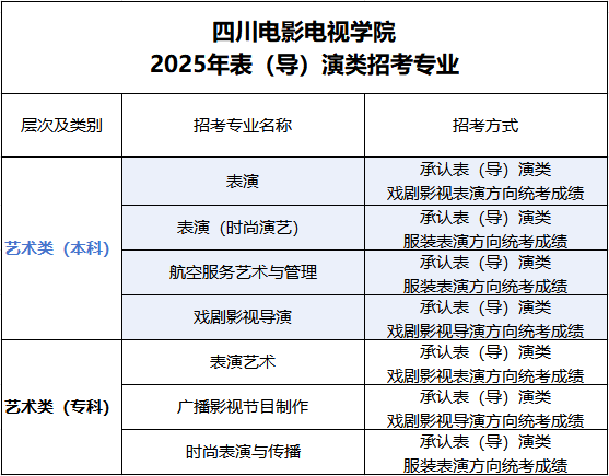 学校共有6个表(导)演类专业,涵盖本科和专科层次。本科专业包括表演、表演(时尚演艺)、戏剧影视导演;专科专业包括表演艺术、时尚表演与传播、广播影视节目制作。
