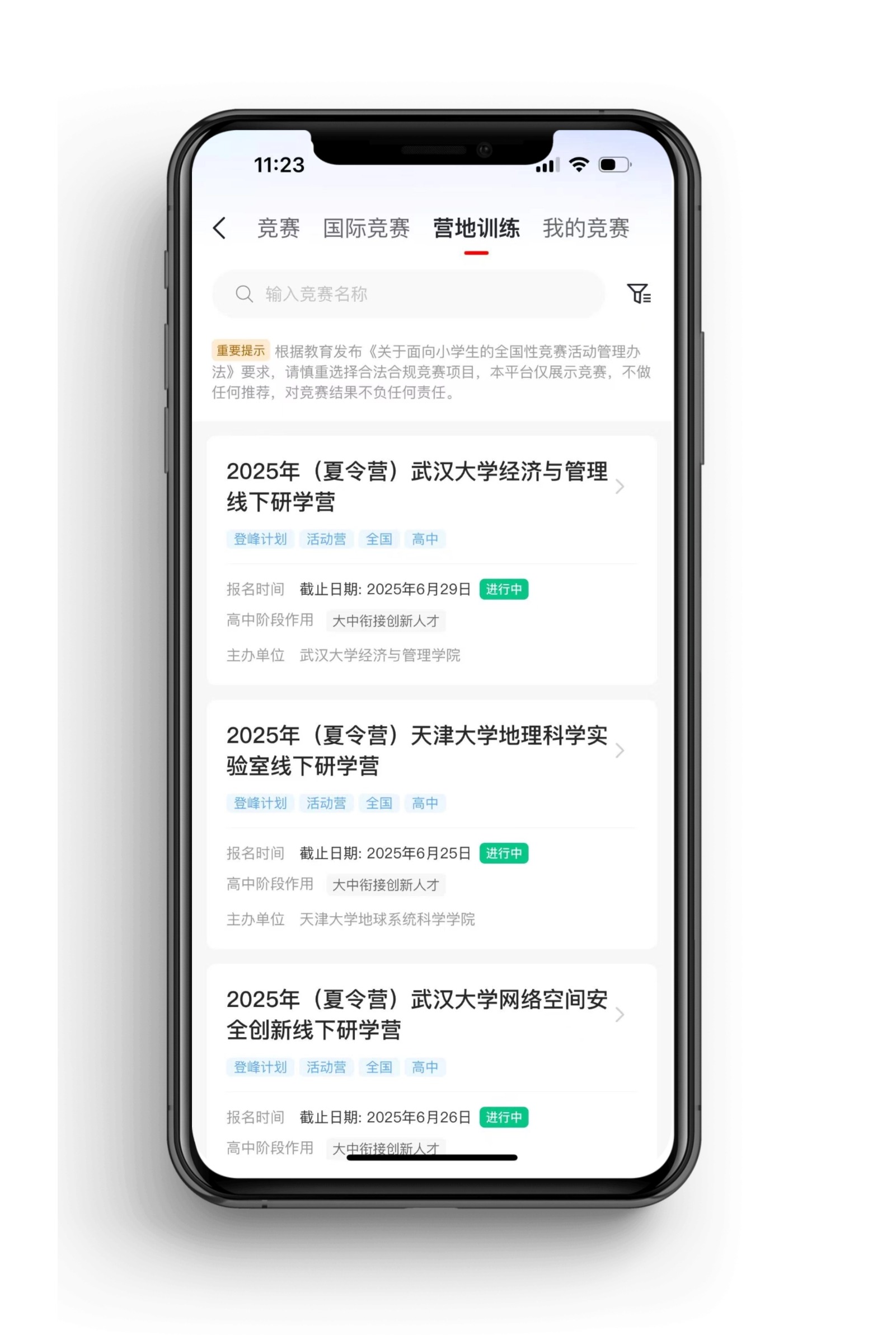 你是否正满心好奇,究竟有哪些院校精心开设了丰富多彩的夏令营活动呢?别着急,只需轻松点击优志愿APP里的【竞赛】专栏,进入该页面后,选择“营地训练”这一板块,就能快速查看当下正在火热报名的夏令营活动啦!