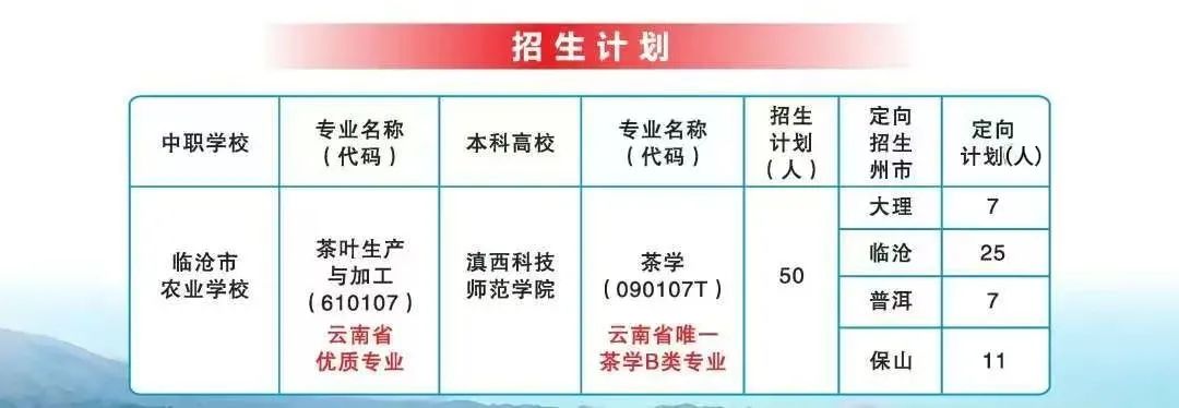 依据《云南省教育厅关于公布2025年职业教育“中高本”贯通培养项目遴选结果的通知》,滇西科技师范学院、临沧市教育体育局与临沧市农业学校联合实施中本“3+4”贯通培养试点项目。中职阶段为临沧市农业学校“茶叶生产与加工”专业(代码:610107),本科阶段为滇西科技师范学院“茶学”专业(代码:090107T)。