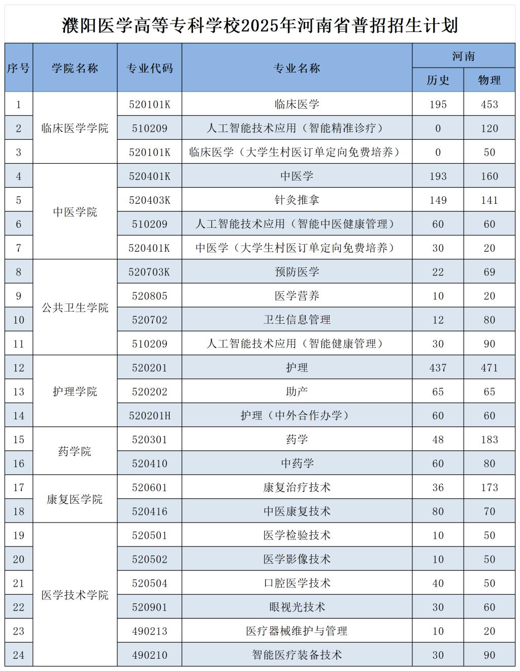 濮阳医学高等专科学校2025年河南省普招招生计划