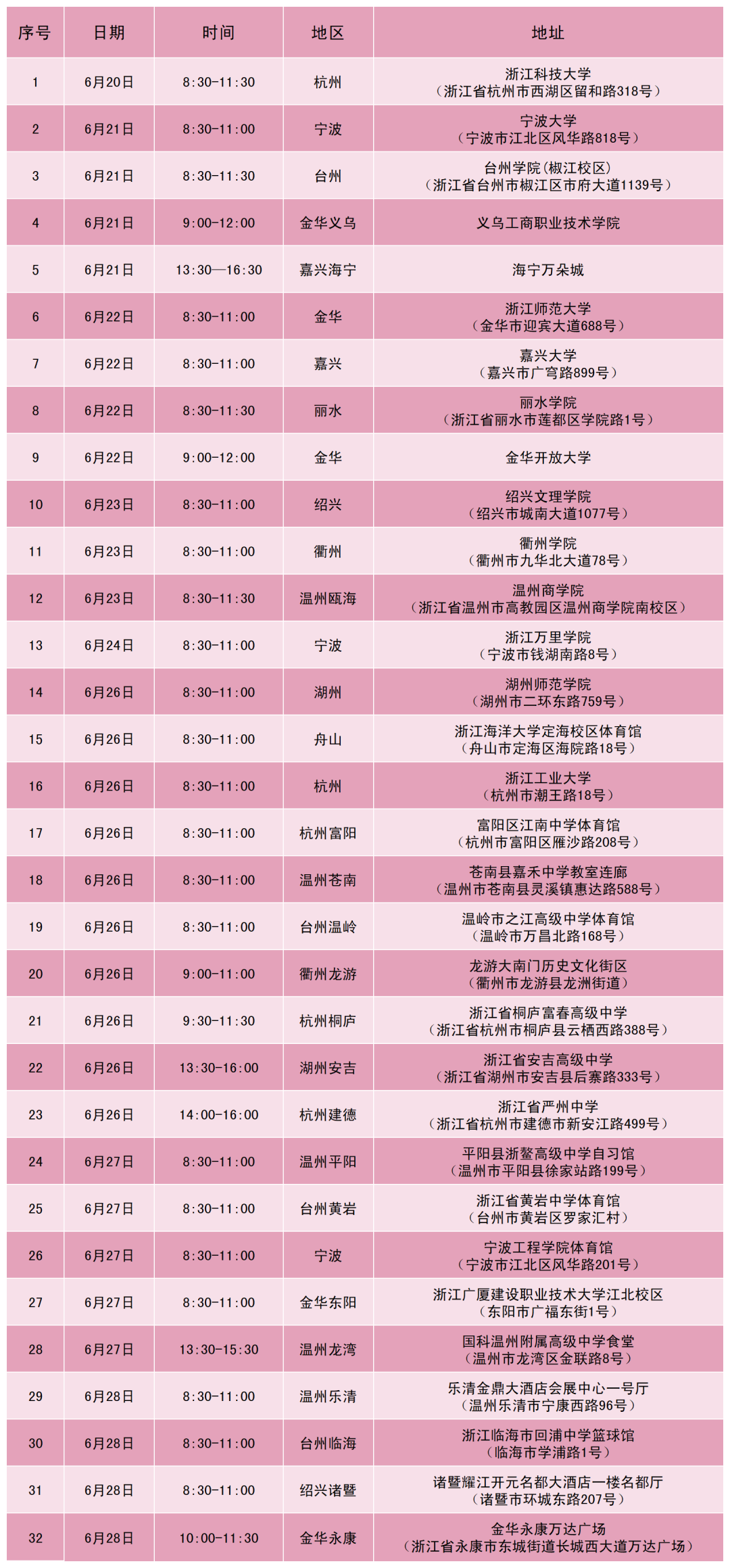 杭州、宁波、温州、台州、衢州、舟山、湖州、金华、绍兴、丽水、嘉兴
