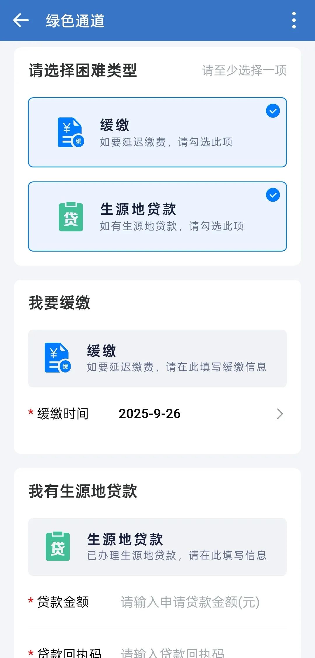进入绿色通道办理,选择困难类型。选择“缓缴”的同学点击选项进入填写缓缴信息。如有生源地助学贷款的同学点击“生源地贷款”(生源地贷款最高可填20000元),填写相关信息。