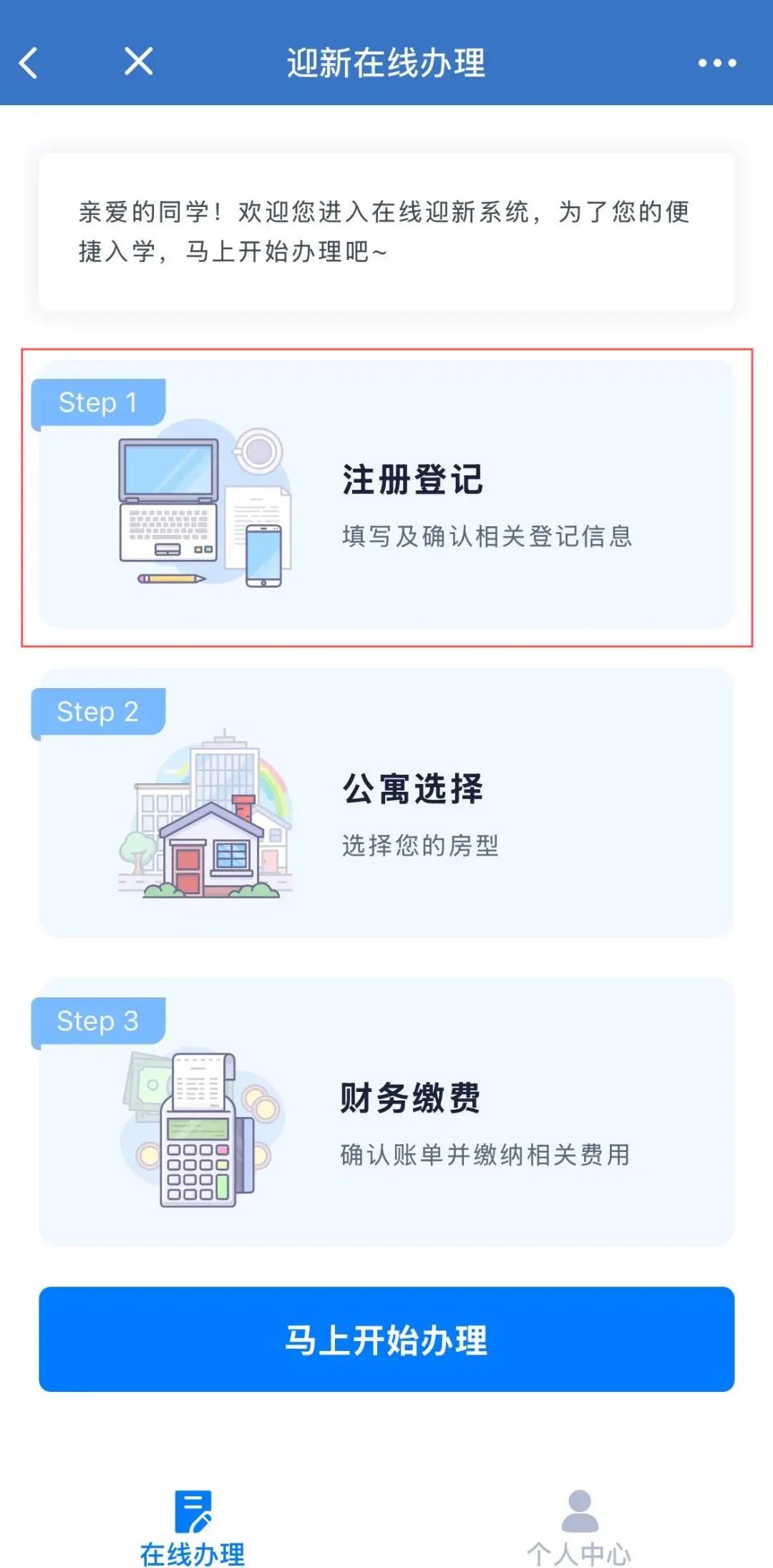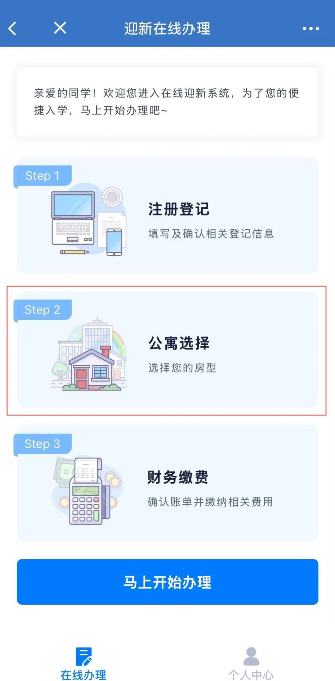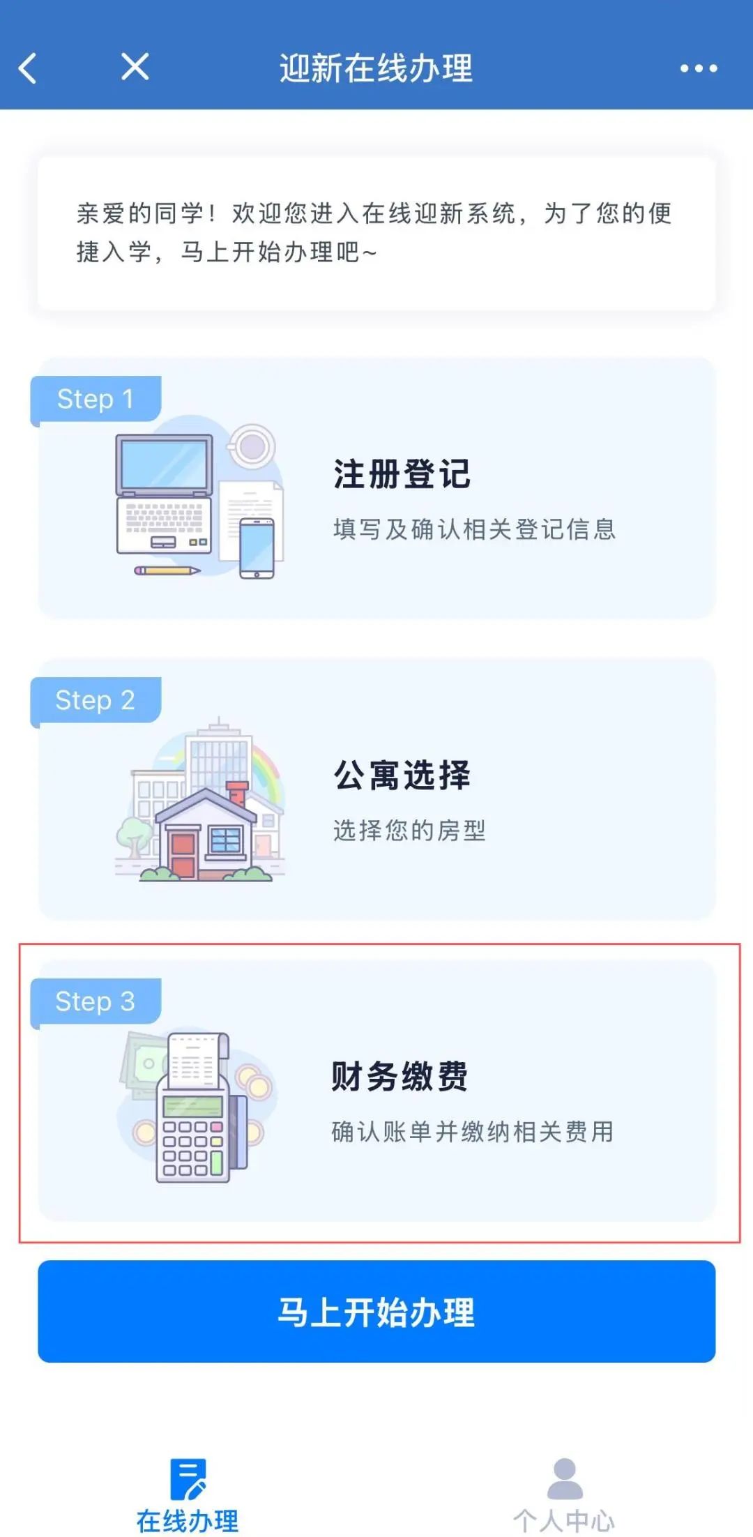 注册登记、公寓选择、财务缴纳等