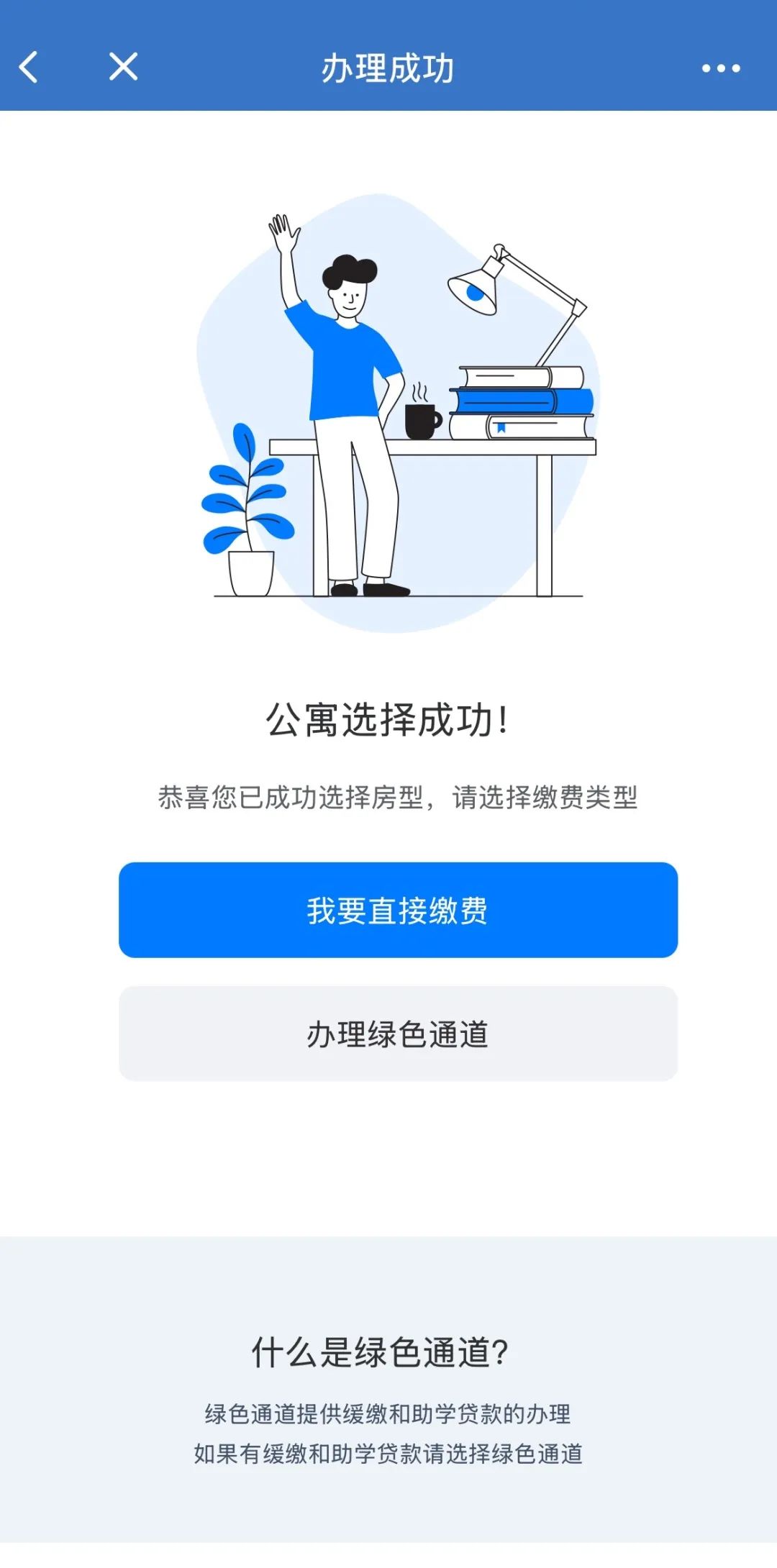 公寓选择成功后,需要选择“缴费类型”。需要办理绿色通道的同学点击“办理绿色通道”进入下一环节;如无需办理“绿色通道”的同学可选择“我要直接缴费”。