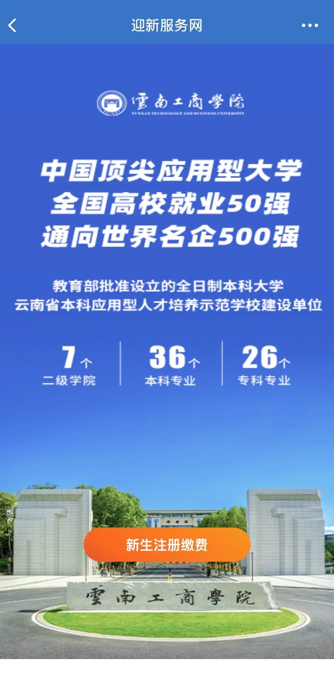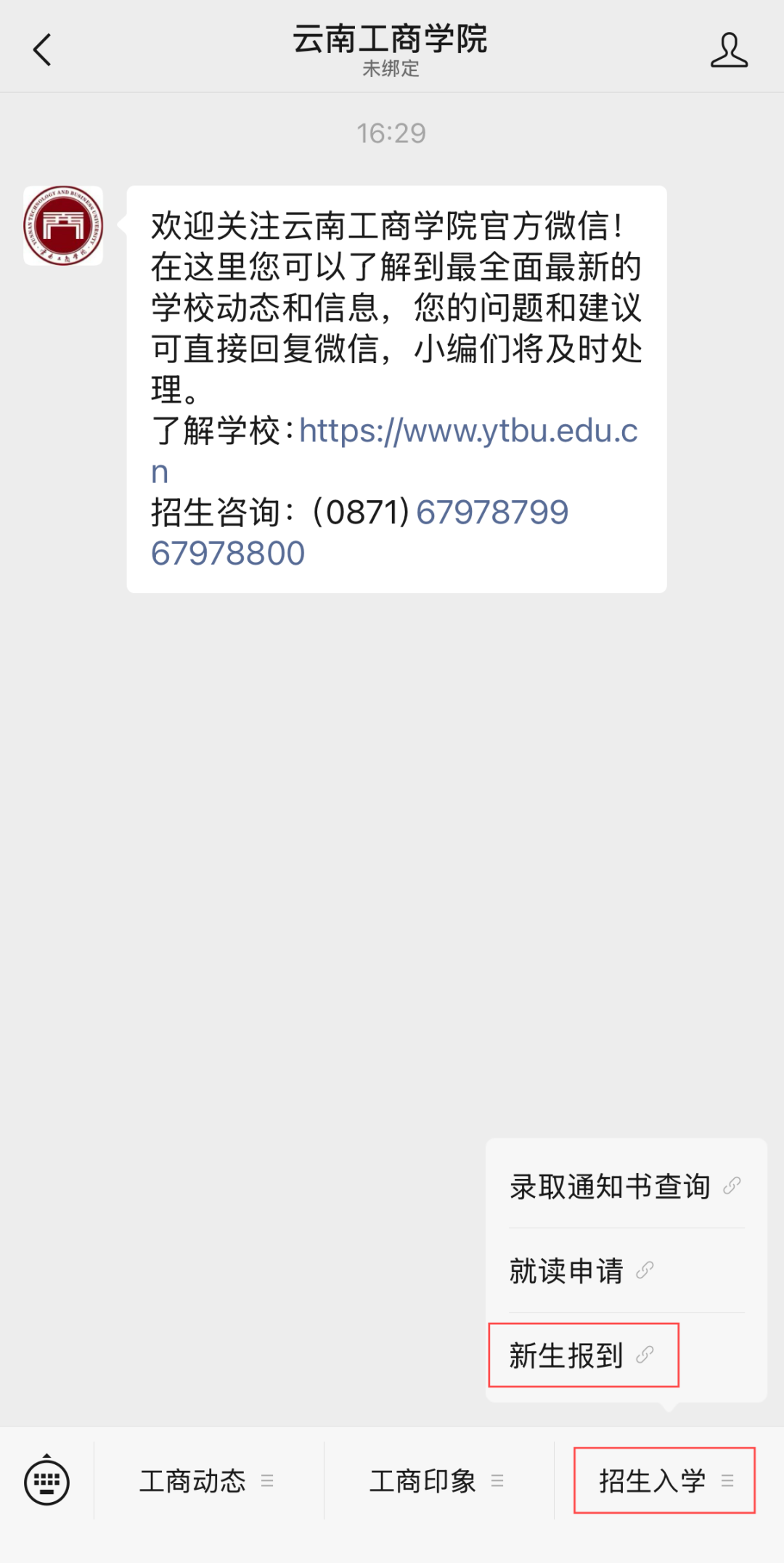 微信搜索公众号“云南工商学院”,点击关注后,点击右下角“招生入学”进入“新生报到”。