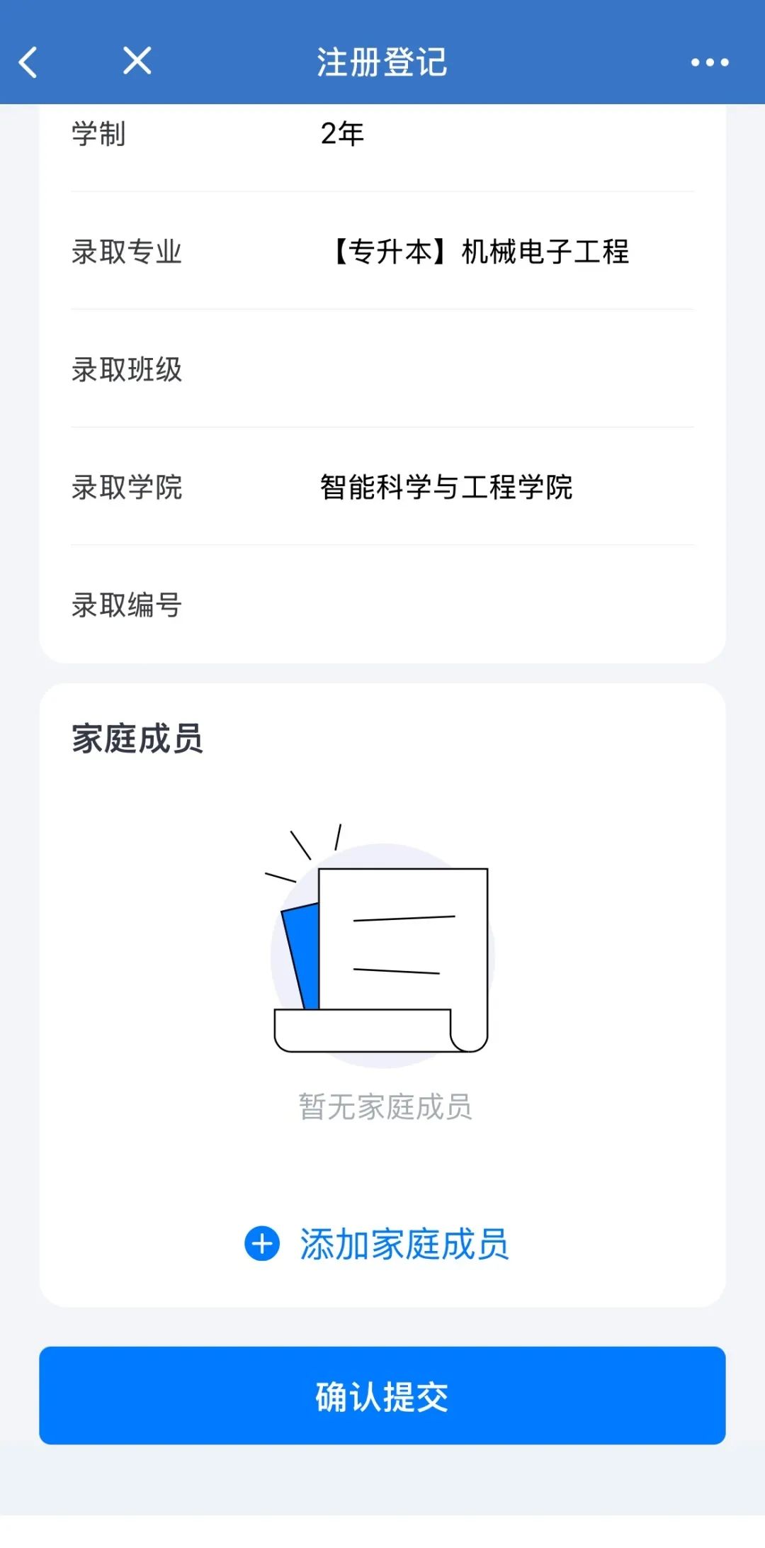 点击注册登记,完成信息录入点击“注册登记”完善个人信息。确认录取信息无误后,填写家庭地址、手机号码、家庭成员等信息,最后确认完成注册登记。
