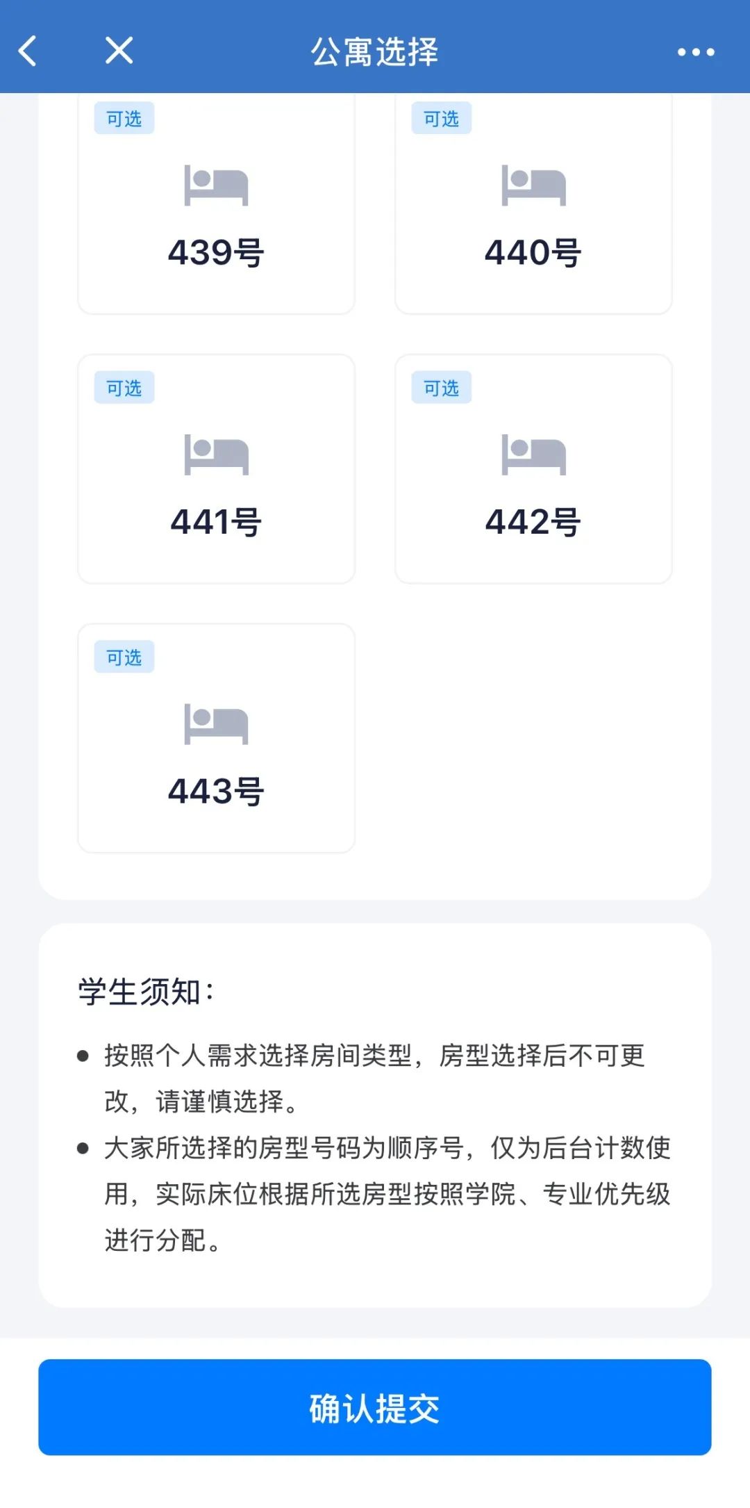 信息提交后点击“公寓选择”,进入选择页面。同学们可以根据自己的实际情况和需求选择公寓类型,选定后点击确认提交。(公寓详情了解点击查看:YTBU住宿“天花板”?卷的不止颜值!)