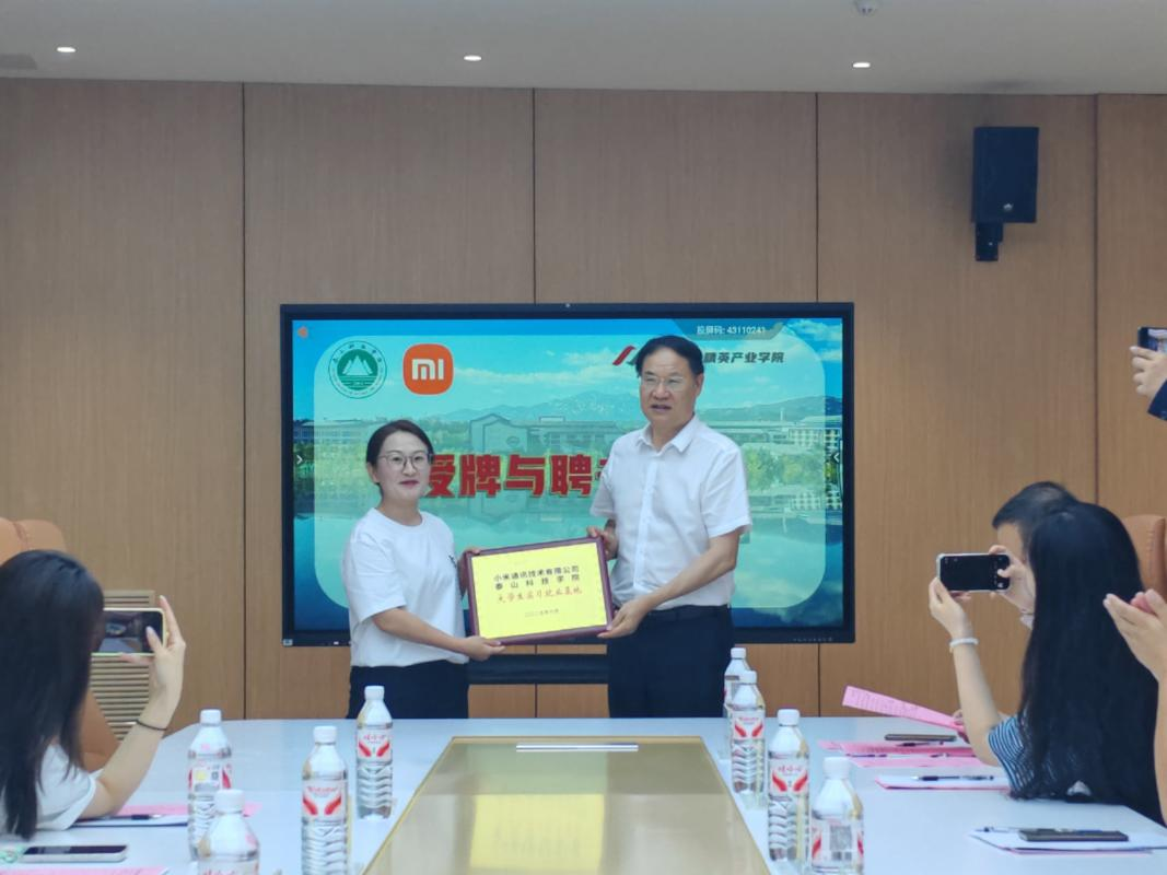 双向授牌仪式:李文喜向小米授予“大学生实习就业基地”牌匾,张园园向学校授予“校企合作基地”牌匾,建立人才输送与实践教学的双向通道。