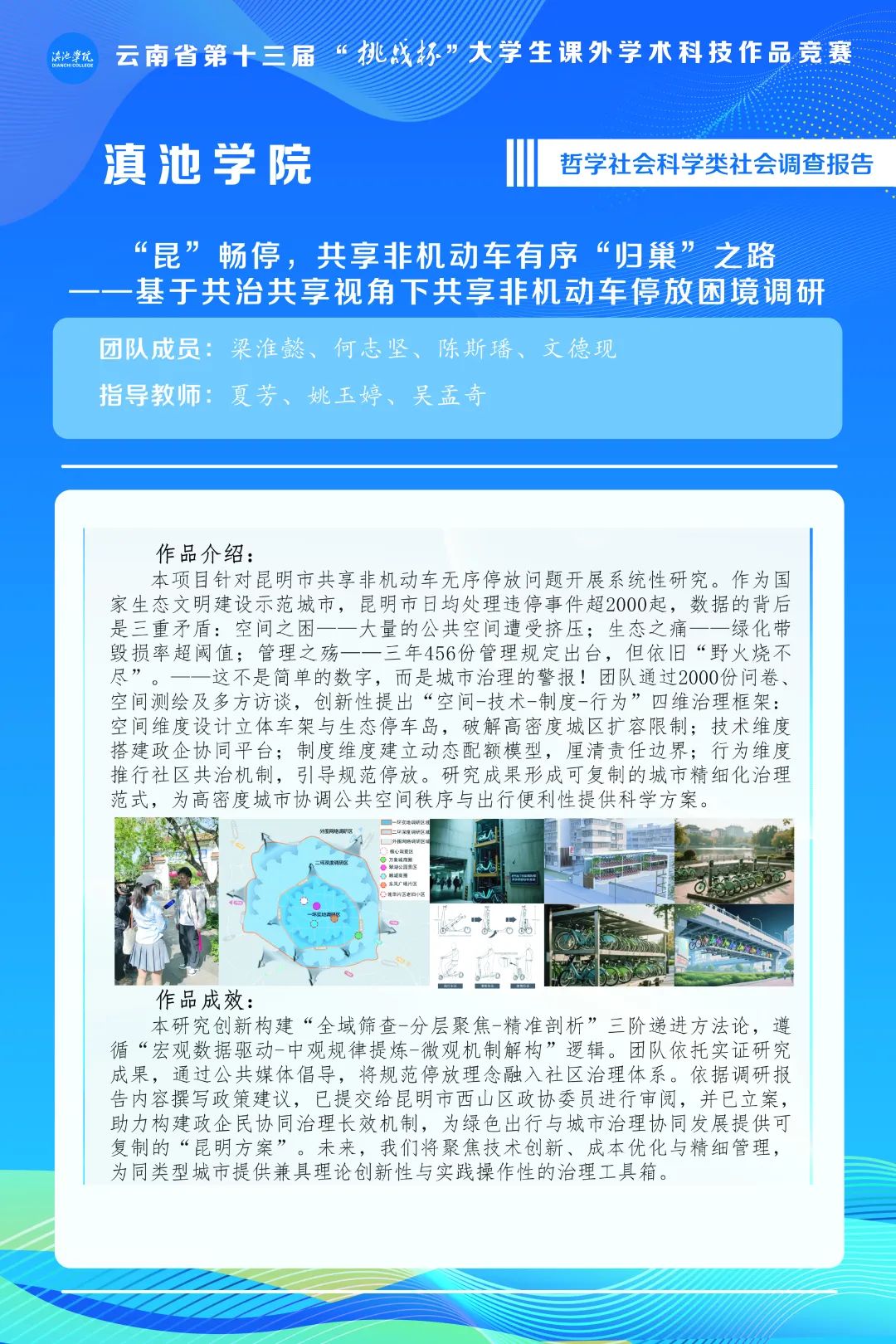 作品名称:“昆”畅停,共享非机动车有序“归巢”之路——基于共治共享视角下共享非机动车停放困境调研