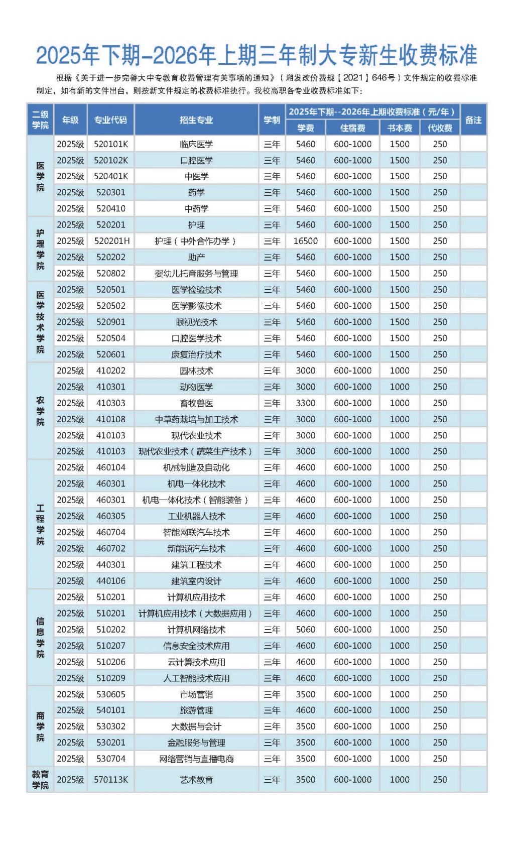 2025年下期-2026年上期三年制大专新生收费标准
