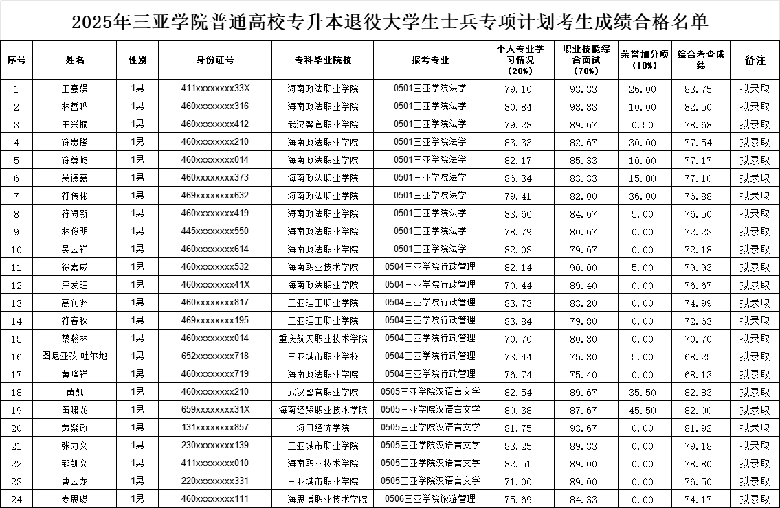 以下为2025年三亚学院专升本“退役大学生士兵”专项计划考生成绩合格名单,“退役大学生士兵”专项考生以及普通专升本各专业合格线上考生预录取资格审核工作开始时间另行通知。