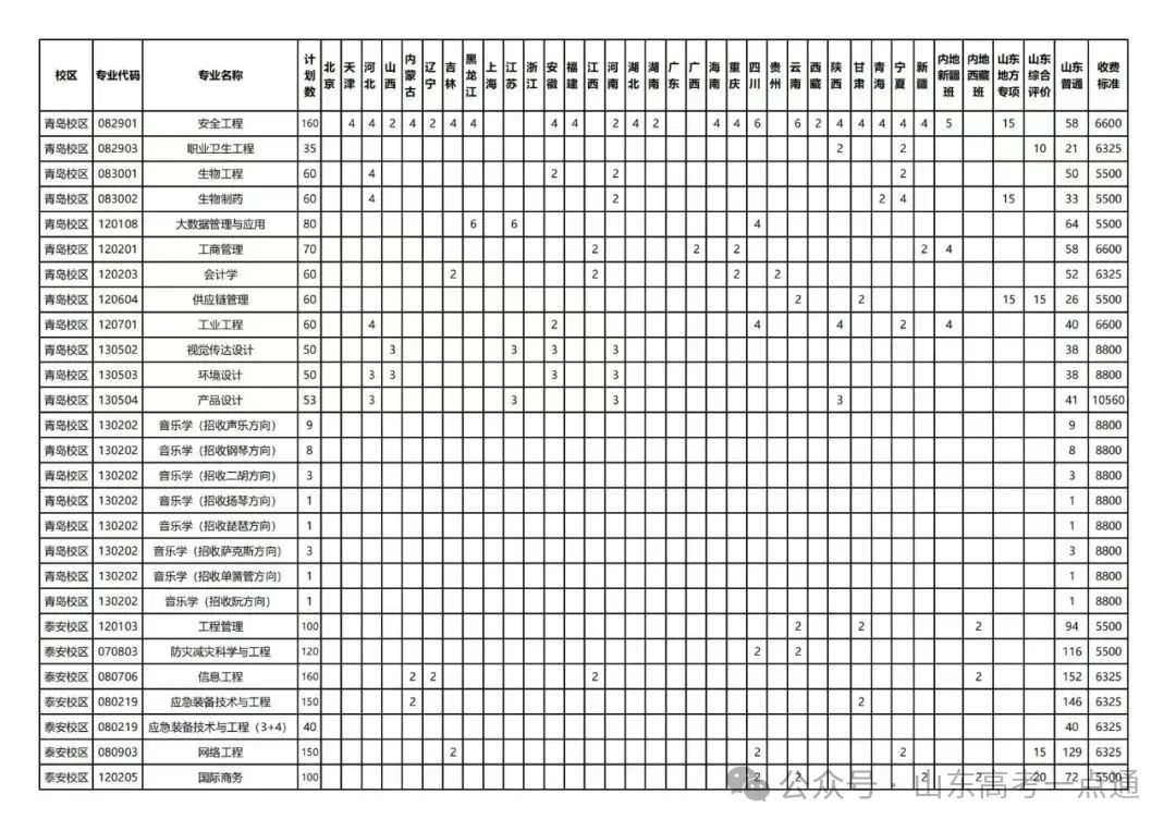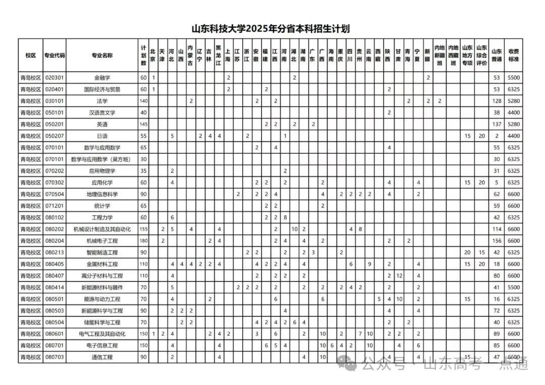 2025年,山东科技大学在全国31个省(自治区、直辖市)计划招收本科生7230人。在工学、理学、管理学、文学、法学、经济学、艺术学等7个学科门类,72个本科专业招生,招收普通类、综合评价、艺术类、地方专项、国家专项、内地新疆班、内地西藏班等计划类别考生。