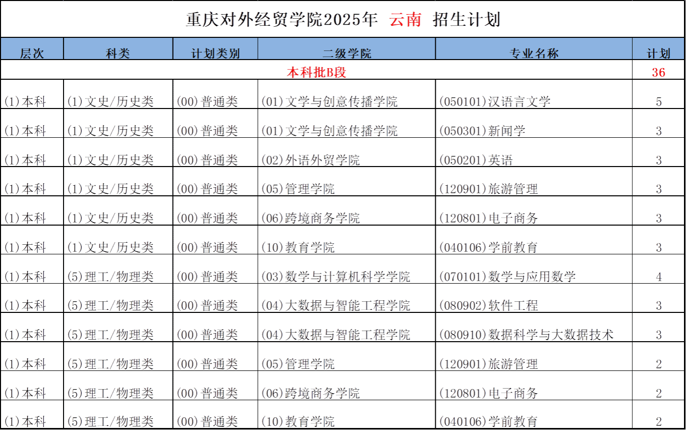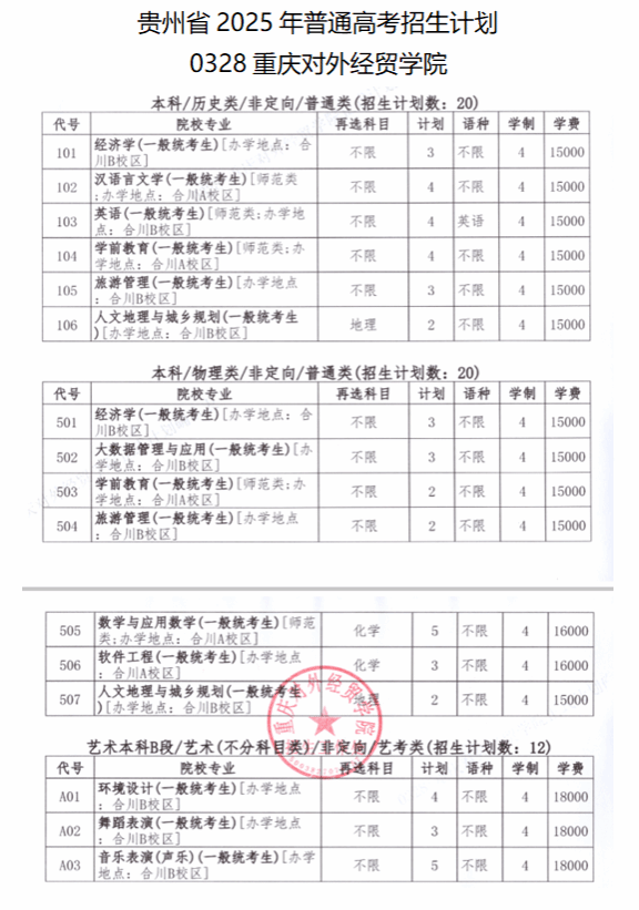 重庆对外经贸学院2025年陕西-贵州-云南招生计划