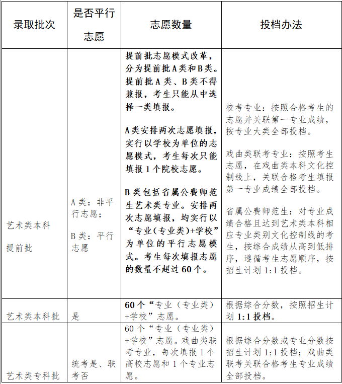 答:安排2次志愿填报。省级统考专业类别内实行平行志愿,考生按“专业(专业类)+学校”志愿模式填报,每次志愿填报数量不超过60个。省际联考的戏曲类专科专业实行院校志愿,考生每次填报1个院校志愿,院校志愿内设1个专业志愿。