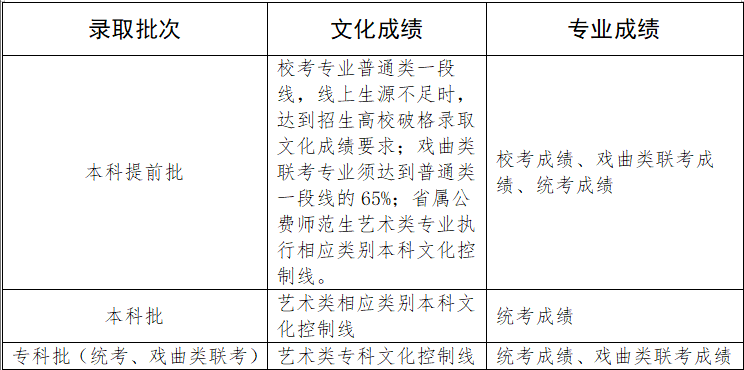 戏曲类专业:实行省际联考的戏曲类专业本科文化录取控制线为普通类一段线的65%。