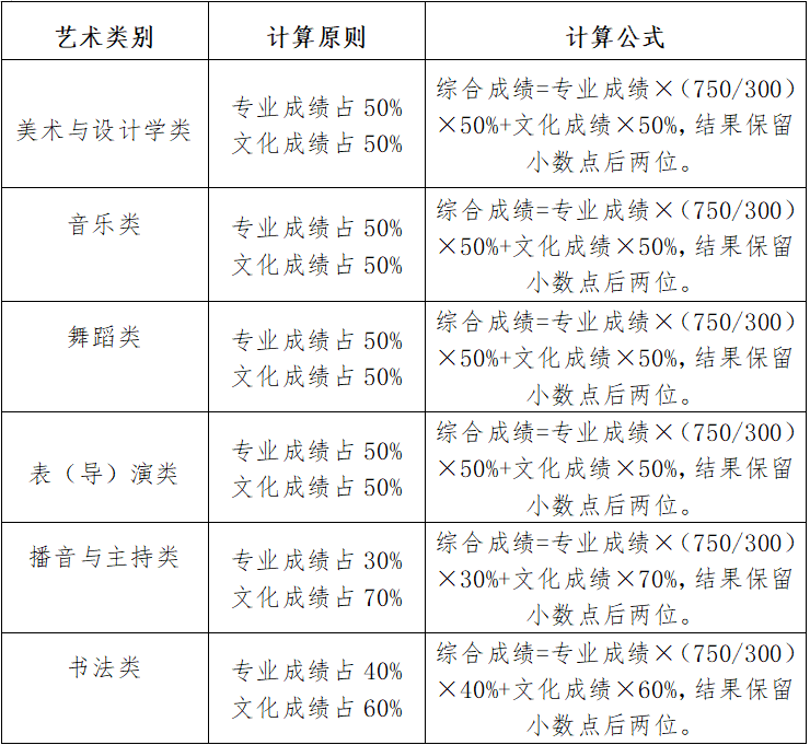 答:体育类综合成绩按照专业成绩占70%、文化成绩占30%的办法计算。综合成绩=专业成绩×750/100×70%+文化成绩×30%(综合成绩四舍五入保留两位小数)。