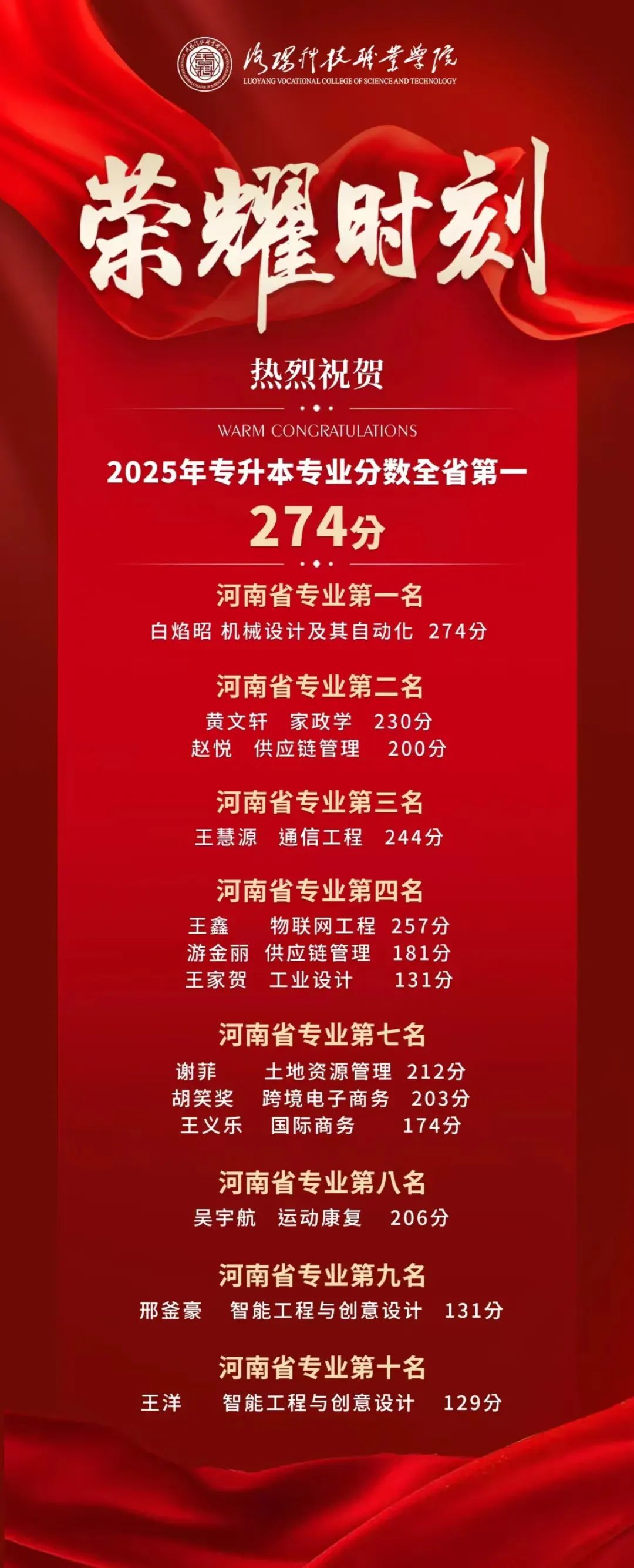 2025年,洛阳科技职业学院取得河南省专升本专业第一名1人,第二名2人,第三名1人,第四名3人的好成绩。这些佳绩充分展现了学校在专升本人才培养方面的卓越成效。除此之外,学校还有许多专升本成功的学子通过努力考取了985及211院校的研究生。