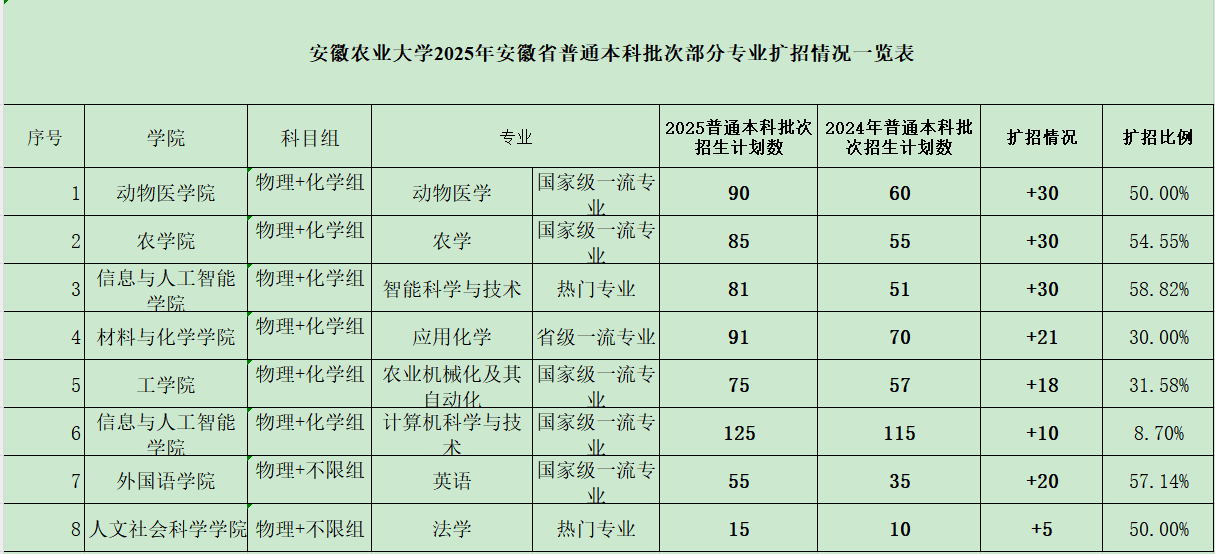 安徽农业大学2025年安徽省普通本科批次部分专业扩招情况一览