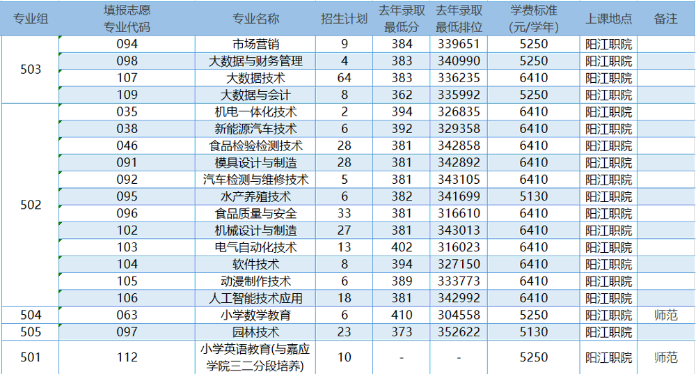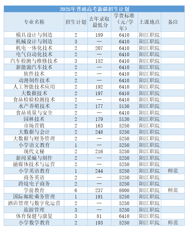 阳江职业技术学院是公办全日制综合类普通高等职业学校,是广东省省域高水平“双高建设”学校。学校前身是阳江师范学校,创建于1916年,是广东省8所拥有百年校龄的高校之一。 学校以“崇德远志,精艺博才”为校训,以立德树人为根本任务,注重五育并举,着力培养具有较高人文素质、较强实践能力和具有持续竞争力的高素质技能人才。学校拥有一支高素质的师资队伍,良好教学质量和教学实习实训场地。