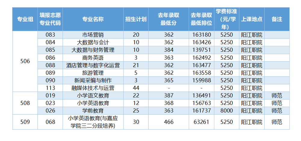 备注:以上招生专业、计划及学费等情况最终以广东省教育考试院招生目录公布为准。以上录取分数和排名仅供参考。表格中往年录取分数和排名空白的专业为今年我校夏季招生新增计划专业,可按照相近专业的排名进行参考。