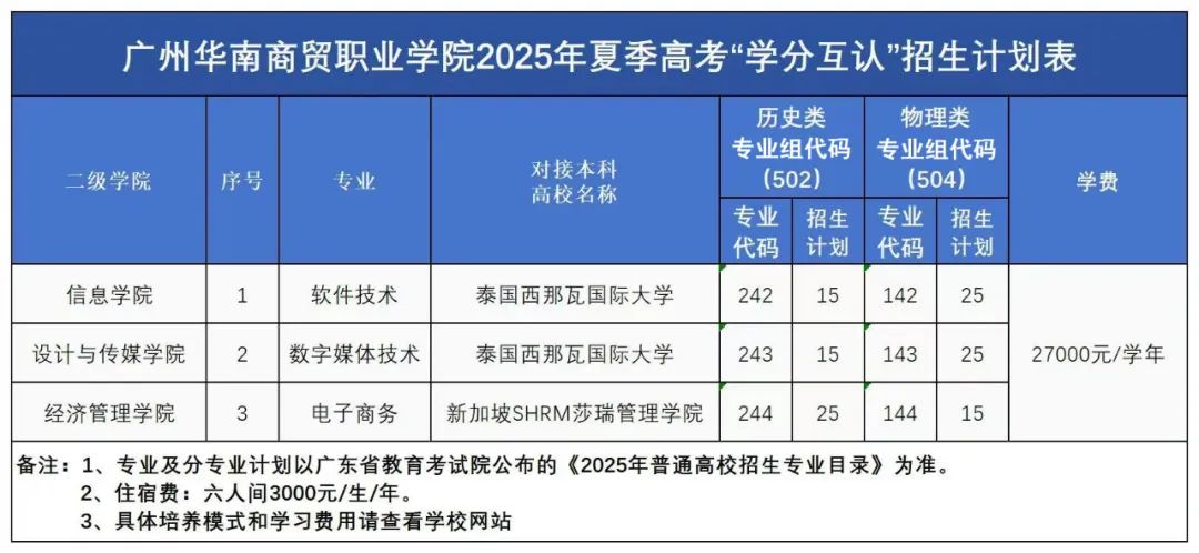 广州华南商贸职业学院与泰国西那瓦国际大学、新加坡莎瑞管理学院合作开展学分互认联合培养项目,采取“3+1”模式。办学层次为专、本衔接教育,即前三年在广州华南商贸职业学院就读,完成所有科目的学分要求取得我校大专文凭,经申请批准后即可赴泰国西那瓦国际大学、新加坡莎瑞管理学院对应本科专业就读一年,修完所有课程符合相关条件者,颁发经我国教育部认可的泰国西那瓦国际大学学士学位证书、英国雷克瑟姆大学学士学位证书。