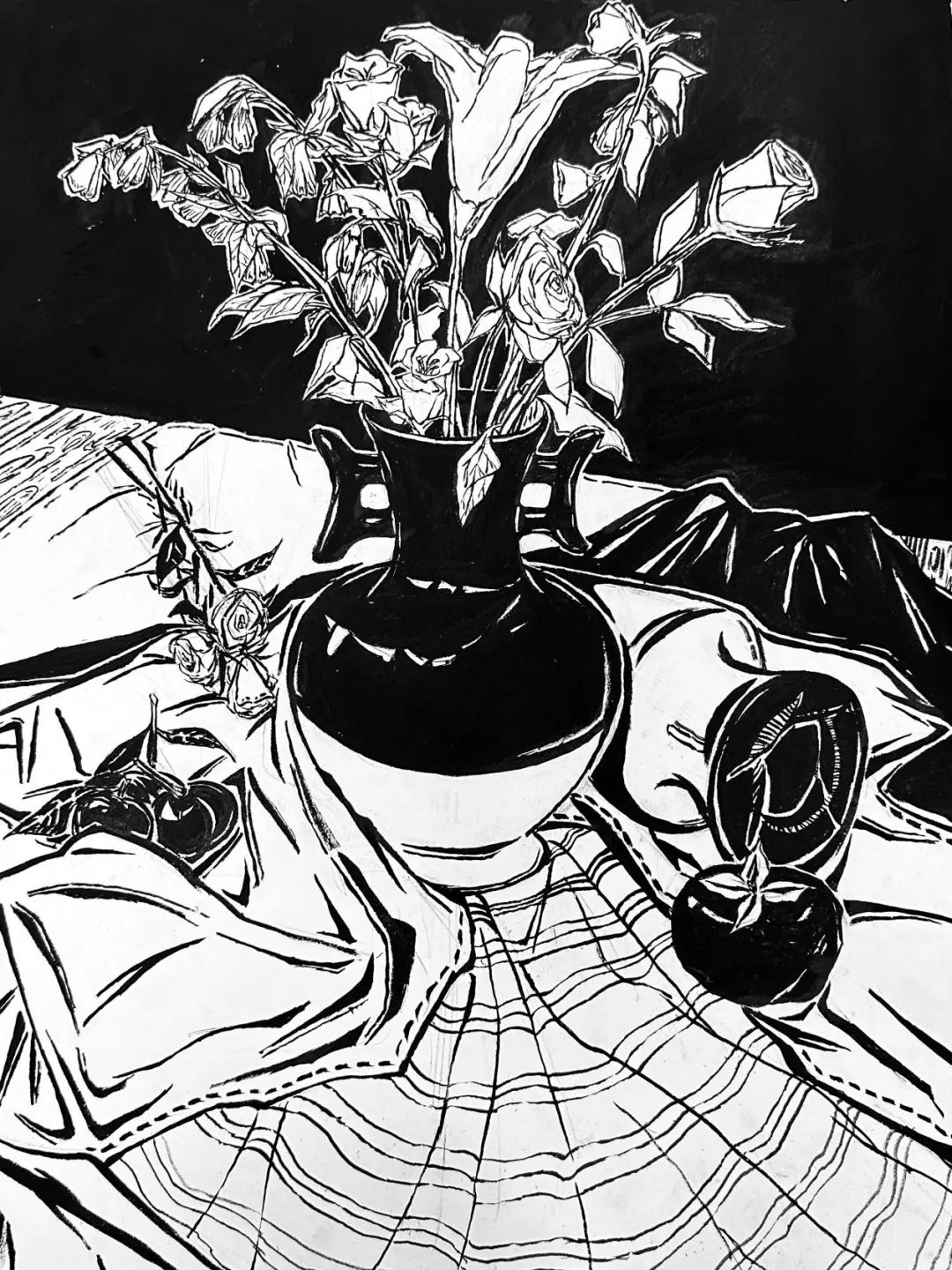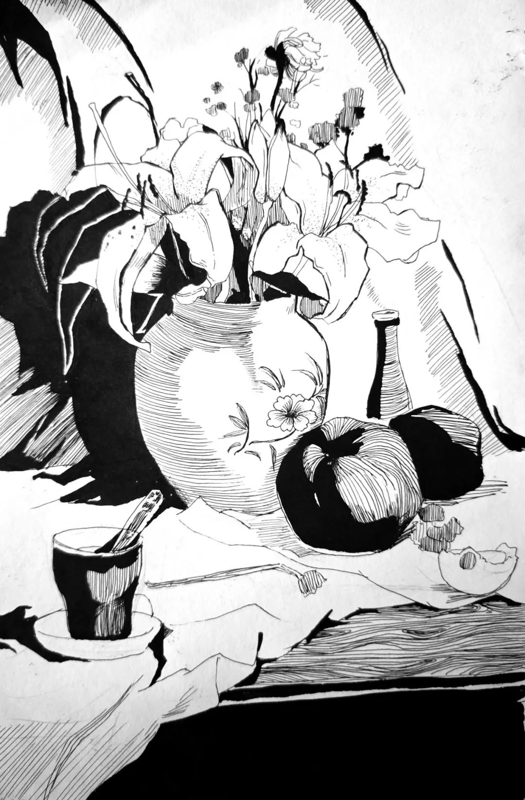 本次线上作品展,展出了2024级漫画专业学生在一学期课程中的阶段性成果。这些作品既有静物、人物、场景等基础写生训练,也开始尝试用图像讲述片段化的叙事。这些看似简单的线条与块面,透露出他们在学习初期对于形式美感、空间意识与表现风格的主动探索。