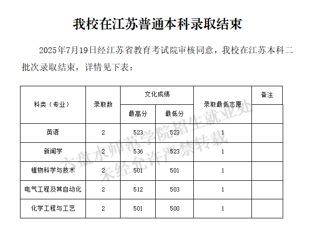 我校在江苏普通本科录取结束