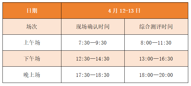 4.选择考试时间:4月12日、13日,每个专业分为上午、下午和晚上,共6个场次,考生自行选择任一场次来校综合测评。