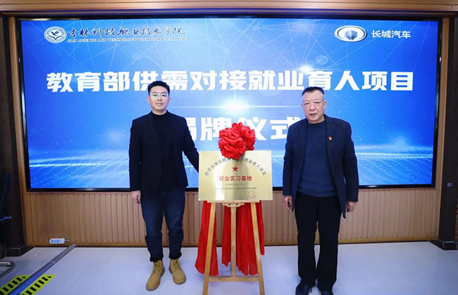长城汽车股份有限公司校企合作经理乔文瑄与吉林科技职业技术学院常务副院长魏建明共同为 “教育部供需对接就业育人项目” 揭牌,宣告“教育部供需对接就业育人项目”正式启动,开启了校企合作共赢的新篇章。