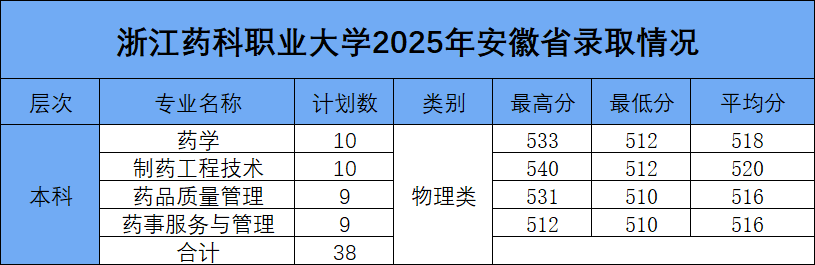 按照安徽省2025年招生录取进程,浙江药科职业大学在安徽省本科批录取工作已圆满结束。本科招生计划为38人,录取满额完成。在本科批录取中,物理类最高540分,最低510分,最低分高出本科线49分。各专业录取情况如下:▲注:最终录取结果,以安徽省教育招生考试院公布为准。