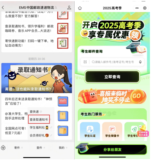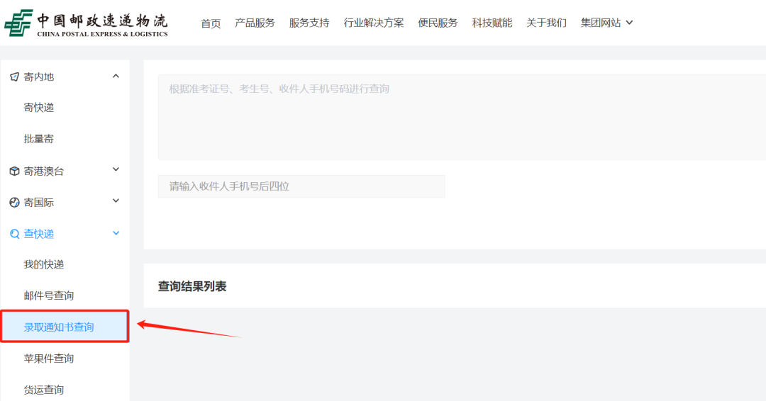 点击菜单栏,点击【查件】,选择【查录取通知书】,输入准考证号(考生号),查询通知书物流动态。