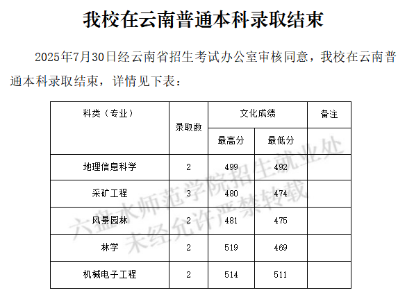 我校在云南普通本科录取结束