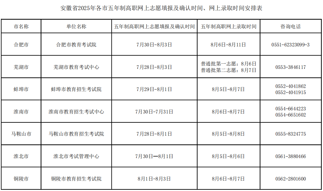 安徽省2025年各市五年制高职网上志愿填报及确认时间、网上录取时间安排表
