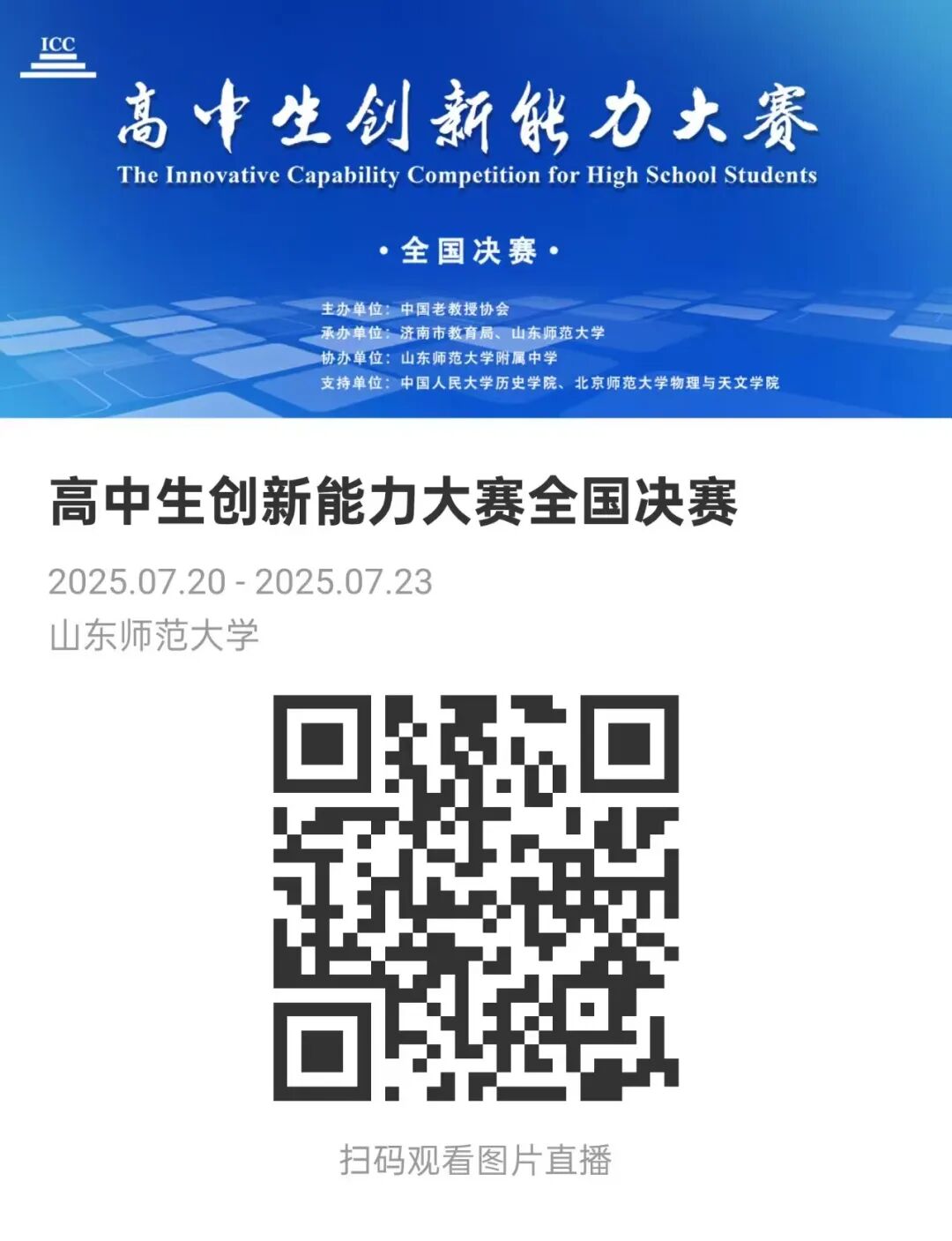 7月23日,2025年高中生创新能力大赛全国决赛颁奖典礼在山东师范大学千佛山校区成功举办,标志着本届大赛落下帷幕。大赛竞委会名誉主席、中国老教授协会会长、北京大学原校长林建华,大赛竞委会顾问赵亮宏、姜钢,大赛竞委会秘书长薛芳渝,山东师范大学党委副书记万光侠,济南市教育局副局长余国先,山东师范大学基础教育发展中心主任毛利新,山东师范大学党委办公室主任李建业,北京大学物理学院原党委书记、教授陈晓林,清华大学化学系教授张复实,中国人民大学化学与生命资源学院教授慕成,南开大学化学学院教授范志金,上海交通大学机械与动力工程学院副教授黄宏成,清华大学数学系副教授梁恒,清华大学机械工程系副教授李津津以及一众学校代表出席颁奖典礼。本届大赛自2024年10月启动以来,吸引了超50万名高中生参与,经过资格审核、全国初赛、全国复赛的层层选拔,最终1500余名选手成功晋级全国决赛。决赛设置了现场教学、即时测评、创新能力综合测评、案例分析撰写与答辩等多个竞赛单元,全面考察学生的创新思维、知识应用与团队协作能力。