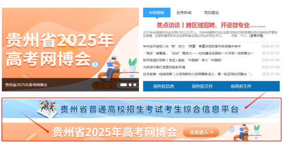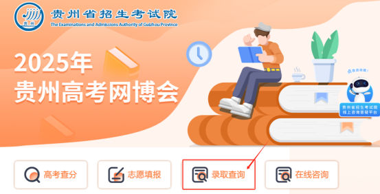 登录贵州省招生考试院官方网站(https://zsksy.guizhou.gov.cn/)首页,点击“贵州省普通高校招生考试考生综合信息平台”进入查询页面,或通过“贵州省2025年高考网博会”入口,点击“录取查询”,输入考生号和密码登录成功后进行查询。