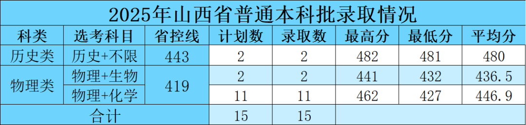 目前,我院2025年山西省普通本科批录取工作顺利结束,计划招生15人,实际录取15人。物理类最低录取分数高山西省省控线8分,历史类最低录取分数高山西省省控线38分。现将有关情况公告如下。