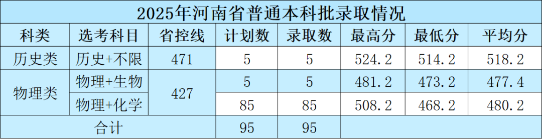目前,我院2025年河南省普通本科批录取工作顺利结束,物理类最低录取分数高河南省省控线41分,历史类最低录取分数高河南省省控线43分。现将有关情况公告如下。