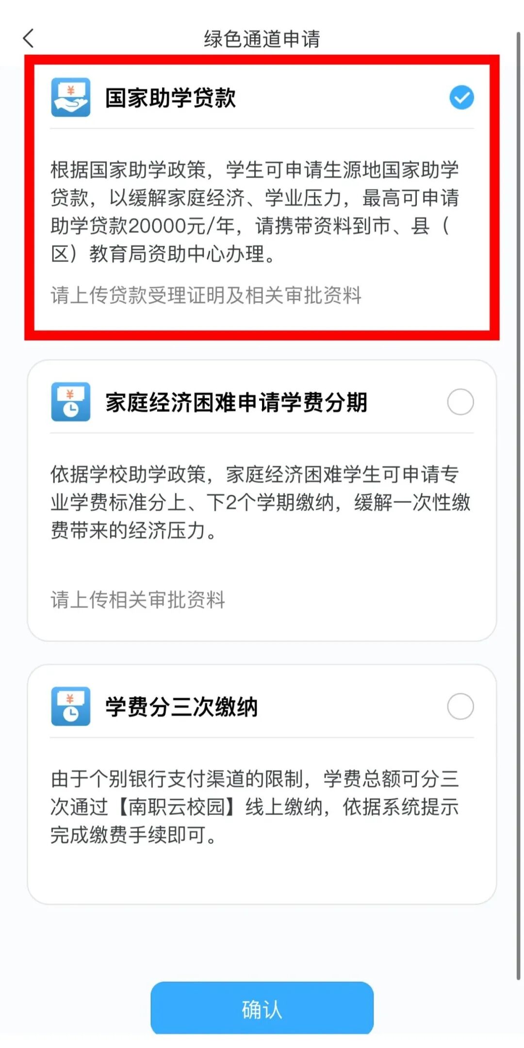 需办理生源地信用助学贷款的同学,请到户籍所在地教育局或学生资助管理中心完成办理,再通过【南职云校园】APP的“绿色通道”缴纳费用。