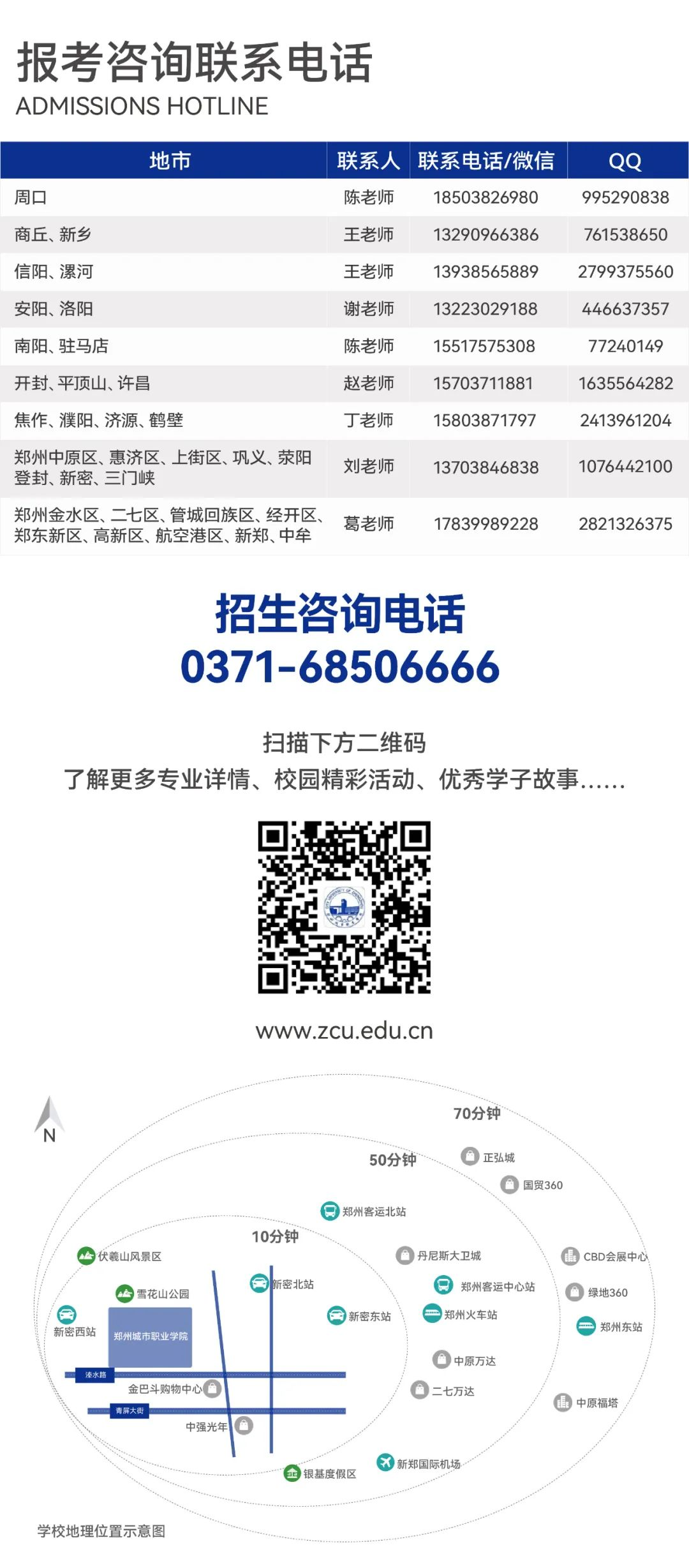 郑州城市职业学院是一所经河南省人民政府批准、教育部备案的普通高职院校,位于国家中心城市郑州。学校开设40余专业及方向,10个优势专业入选河南省职业教育特色院校项目骨干专业,是全国唯一开设耐火材料专业高职院校、是中国校友会全国高职院校50强。学校秉承“让每一位学生获得职业成就和人生幸福”的使命,着力培养大国工匠、能工巧匠、高技能人才,已连续五年毕业生去向落实率达98%以上,《“一二三四”就业工作体系 精准对接中原经济区建设需求》获评河南省2024年度高校毕业生就业工作典型案例,聚焦京东、比亚迪、海康威视、格力等世界500强名企,毕业即高薪高质量就业。宣传片《与光同行》