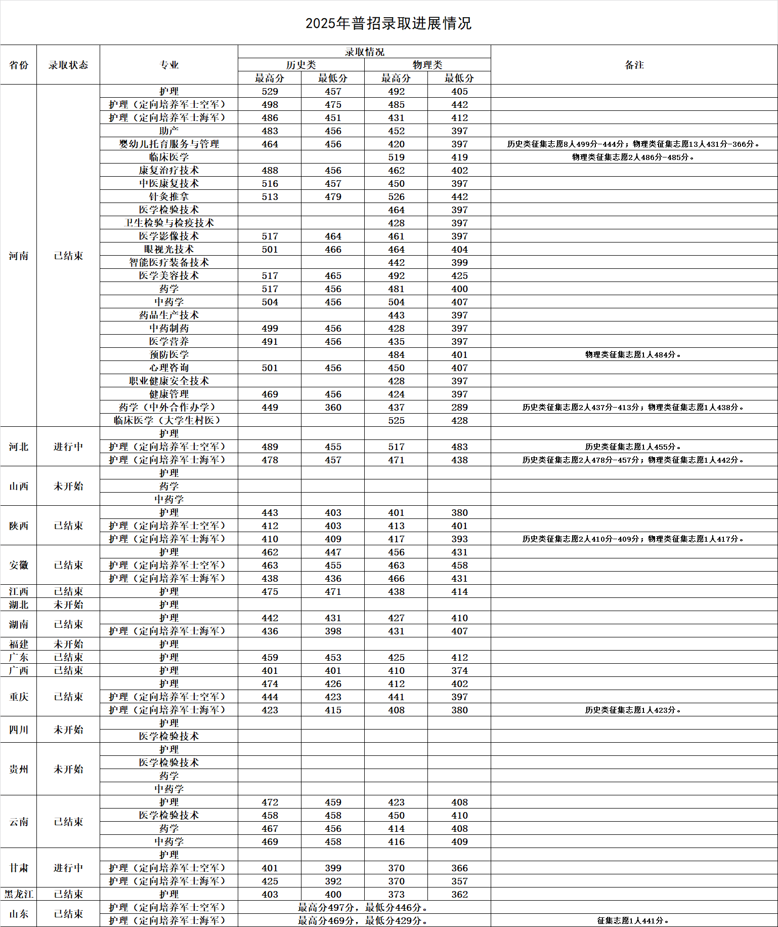 我校在河南省及部分省外招生省份普通专科招生录取工作已结束,现将录取进展情况公布,供考生参考。显示已经录取结束省份的考生可登录学校招生信息网“录取查询”模块查询录取专业。学校定于8月18日通过邮政特快专递EMS邮寄录取通知书,请同学们保持高考报名时填写的联系电话畅通,新生报到相关事宜请阅读快递中《新生入学指南》。2025年普招录取进展情况如下: