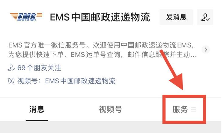 1.微信搜索“EMS中国邮政速递物流”,进入公众号后点击标题栏“服务”;