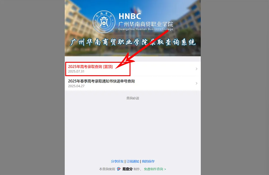 进入微信公众号【华南商贸招生办】,点击【服务】,再点击【25年高考录取查询】输入10位数准考证号、姓名,即可查询录取结果。